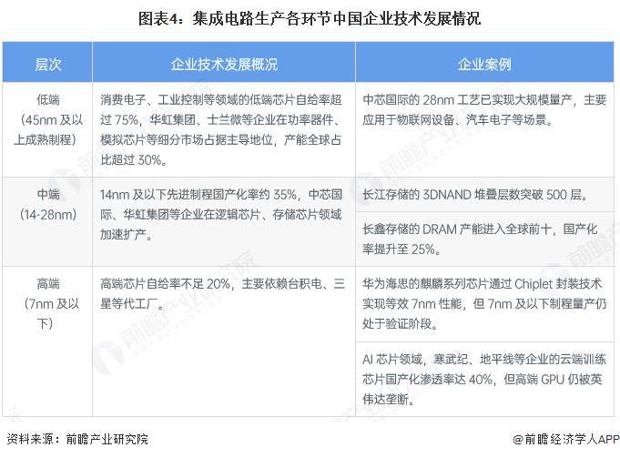 中国集成电路不同制程市场发展差异显著,优势明显集中于中低端,高端市场受海外限制。具体来看,低端市场(45nm及以上)自给率超75%,华虹集团等企业主导细分领域且产能全球占比超30%;中端市场(14-28nm)国产化率约35%,存储芯片领域取得突破,但受高端设备进口制约;高端市场(7nm及以下)自给率不足20%,依赖海外代工厂,仅部分领域有技术进展,核心环节仍被海外垄断。