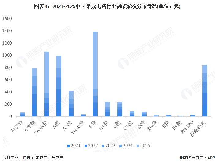 近五年来,我国集成电路行业融资轮次最多为B轮,且天使轮、PreA轮、A轮等早期轮次的融资数量显著高于C轮及以后的中后期轮次,是行业融资的主力,初创项目的获投活跃度较高。除此之外,战略投资的事件数也较多,体现了企业在构建长期产业生态时,融资积极性较高。