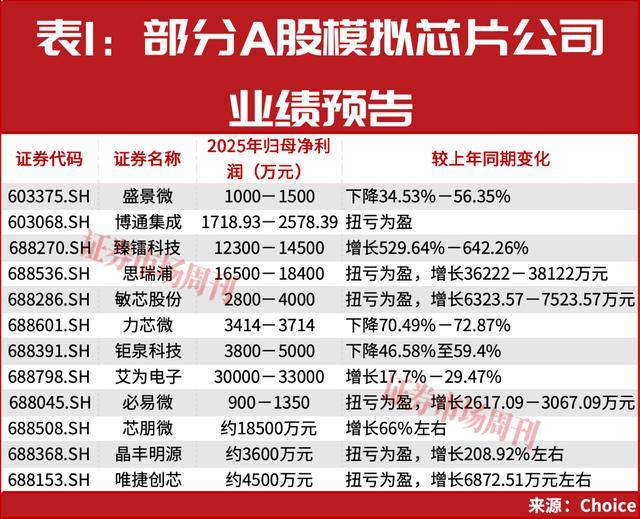 随着近两年存储芯片涨价潮带动,模拟芯片价格逐渐企稳。2025年业绩预告显示,多家模拟芯片厂商业绩大增或扭亏为盈。