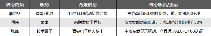 核心团队的专业背景与公司“深耕LED驱动IC+拓展新型显示”的战略定位高度契合,有效提升了研发成果的转化效率。