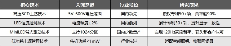 技术优势方面,公司核心技术聚焦于LED驱动芯片的关键工艺,在高压BCD制程、LED恒流控制、MiniLED背光驱动等领域形成了国内领先优势,核心技术详情如下: