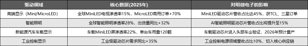 下游多领域需求的持续爆发,形成了对LED驱动芯片的全方位拉动,其中高端显示是核心驱动力量,智能照明、车载显示则为行业提供了新增量支撑,具体影响如下表所示: